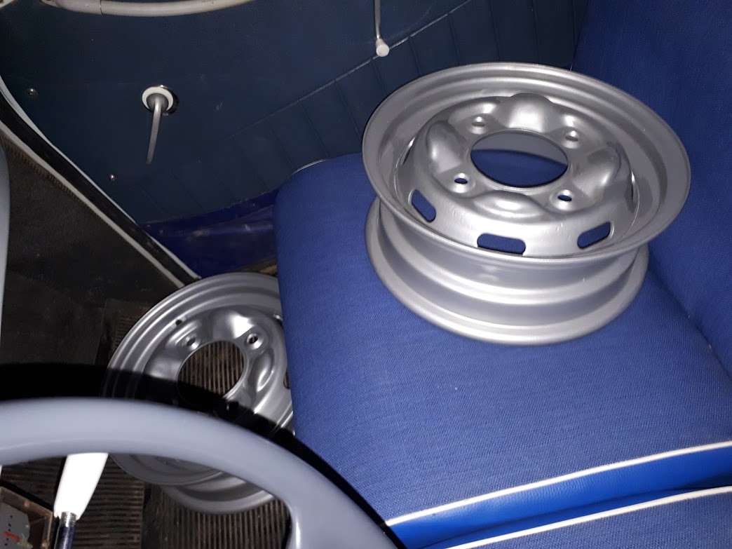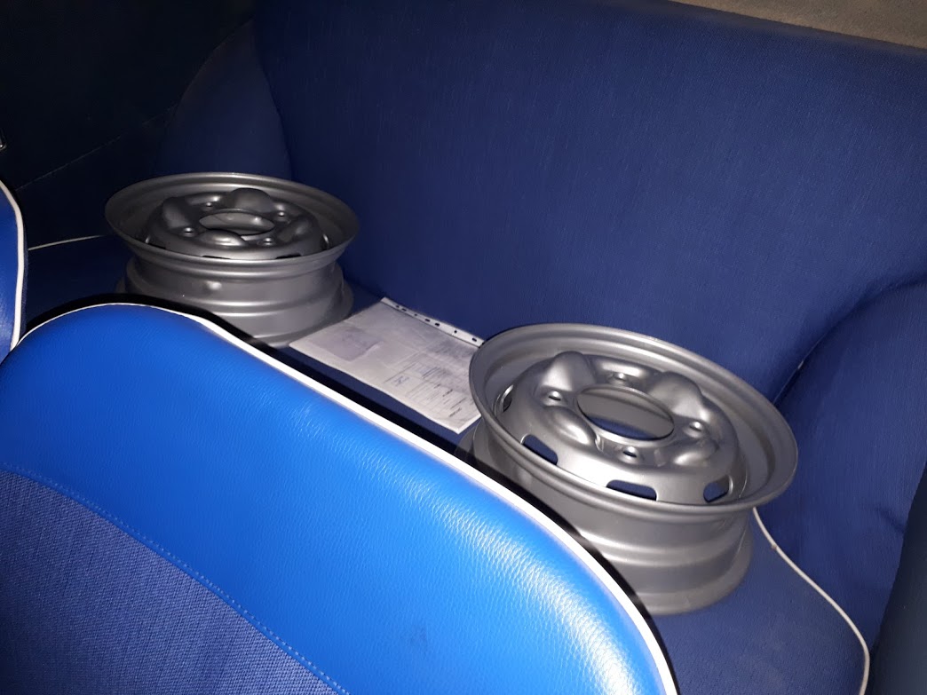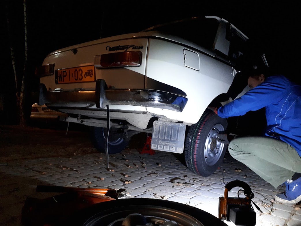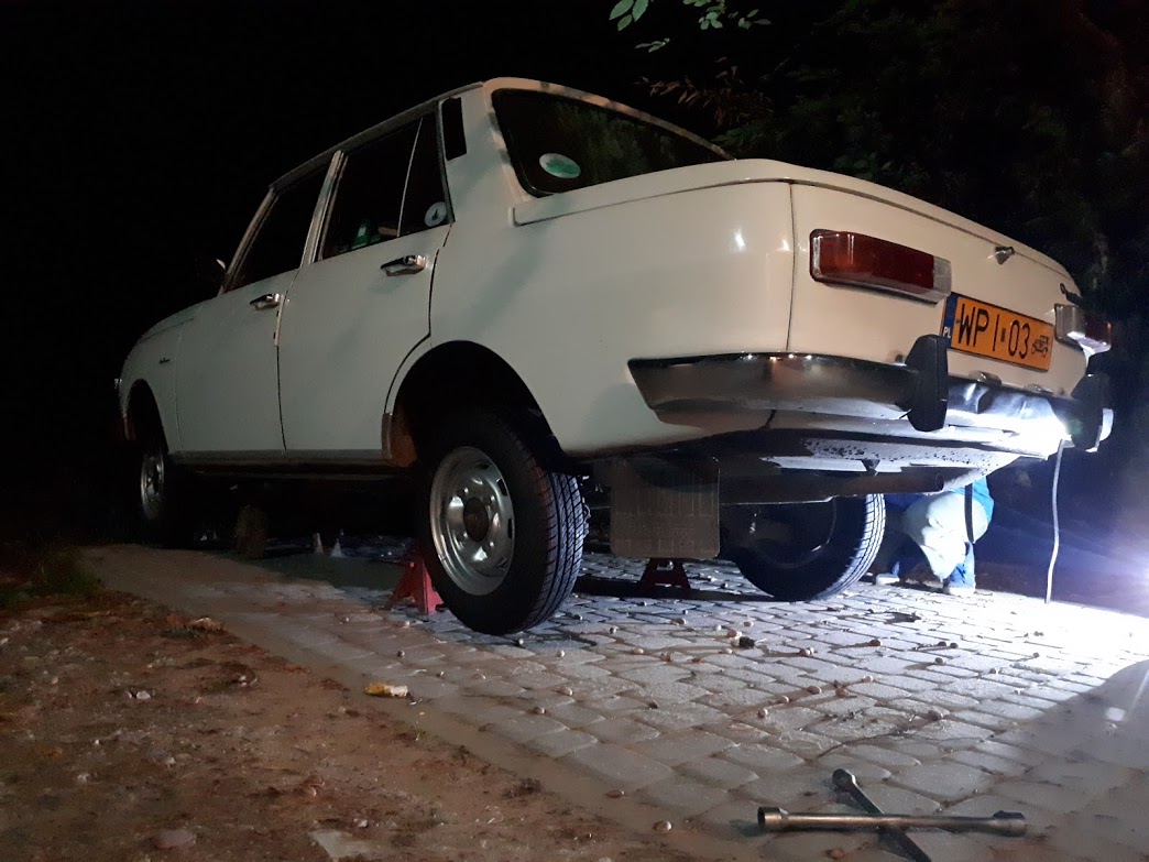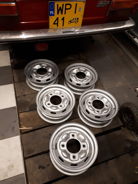 Wieczorową pora pojechałem syreną do Pawła, aby odebrać pomalowane piecowo felgi od Walusia. Waluś stał na kobyłkach które to musiałem zwolnić, aby postawić na nich fiata. Felgi wyszły cudnie. Grzanek pomógł je założyć (wartburg dostał nowe opony barum, które to z kolei polecił Karol www.gratywołomin.wordprecs.com )i mogliśmy zając się sanitarką.