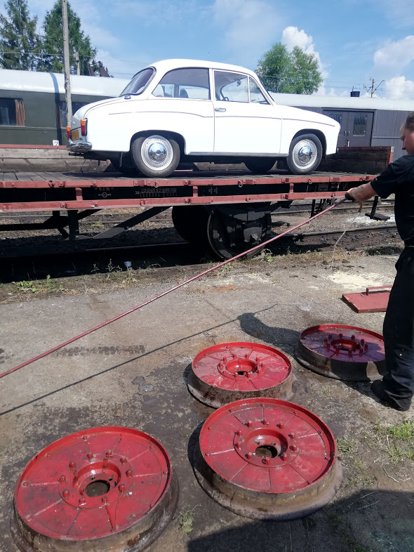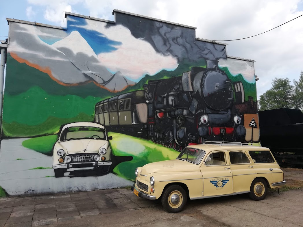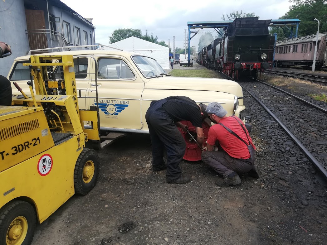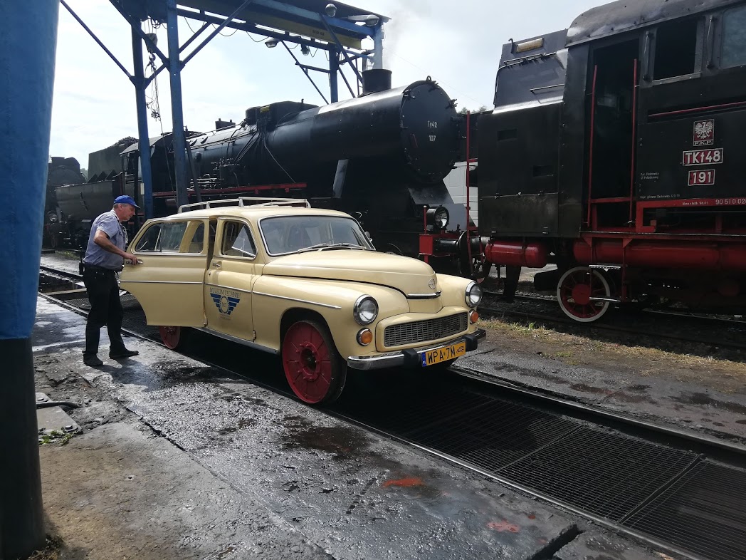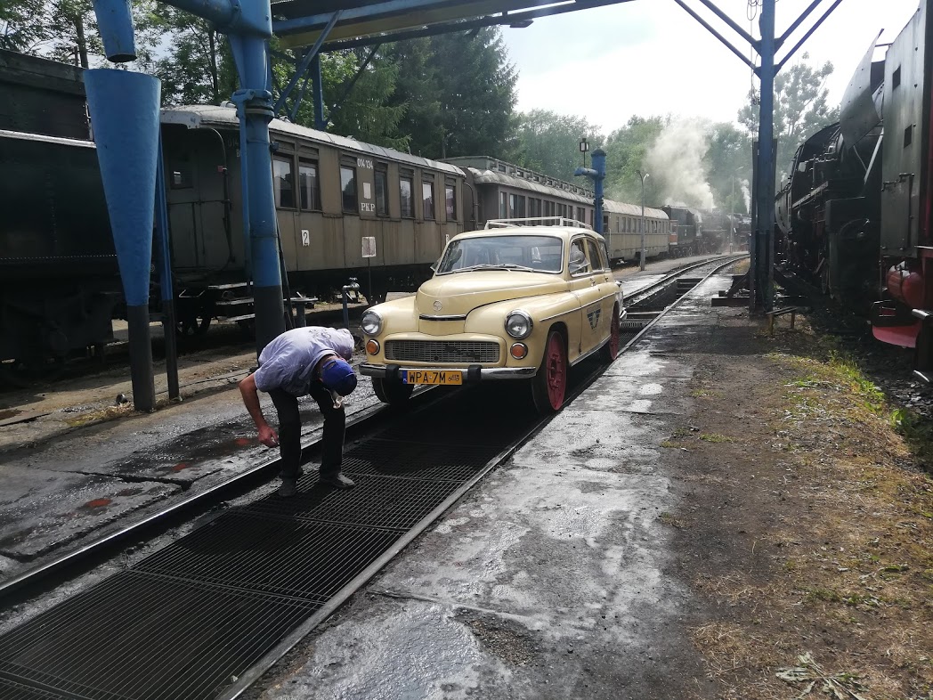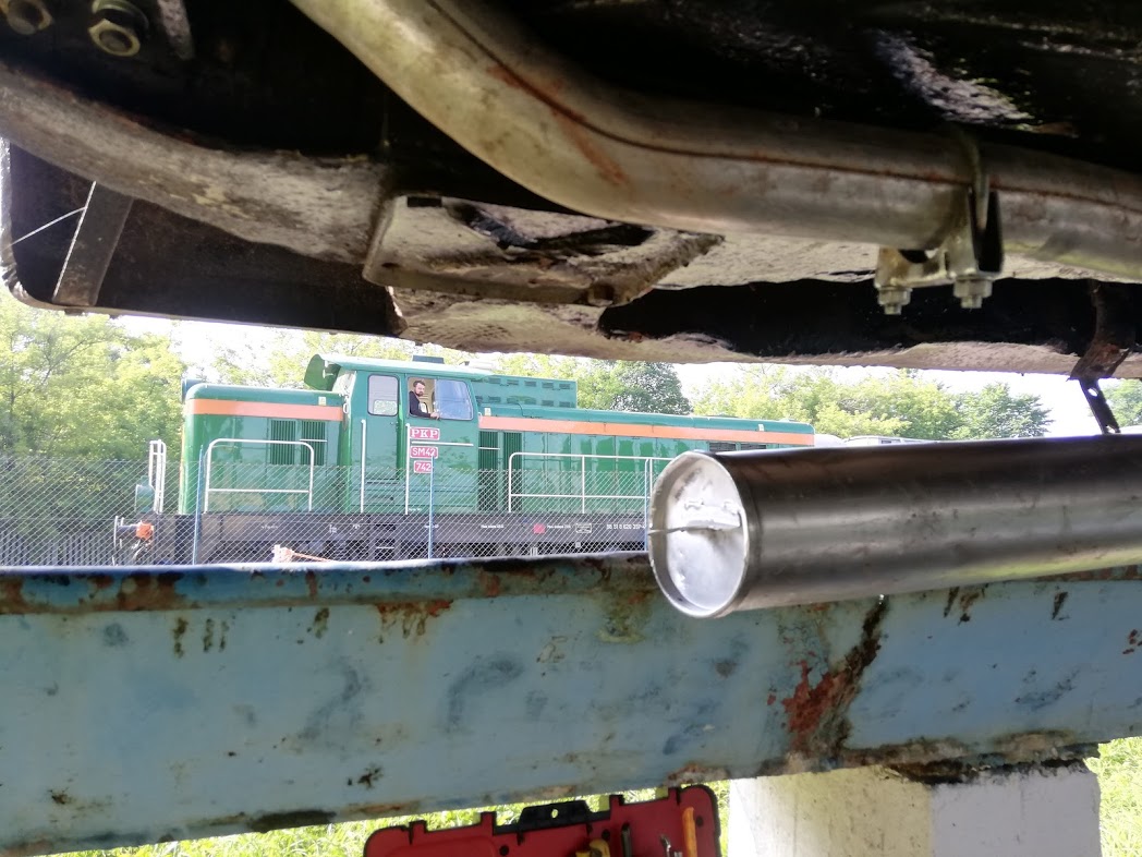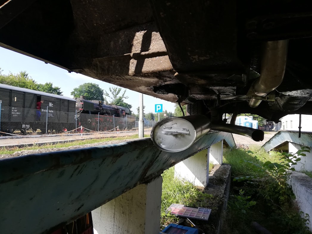 W piątkowy poranek, wyspany i wypoczęty ( wstałem już o 3, tyle emocji) o 6.30 dojeżdżam do Skansenu stopem ( zabiera mnie przesympatyczny Pan Marek i Kamil). Szybka kolejowa kawa i wjeżdżam na podjazd ( podjazd z dawnych czasów gdy w lokomotywowni eksploatowano jeszcze żuki) jest idealny dla naszego wozu. Wyrywam pokrzywy i wchodzę pod wóz. Tutaj czeka mnie wymiana brzęczącego tłumika i przewodu hamulcowego. Naprawa idzie sprawnie, pozdrawiają mnie wjeżdżające składy: Krzysztof w SM42-742, Ty42-24 z już zaprzyjaźnionych Pyskowic a z drugiej strony Wolsztyn z Pt47-65. Szybka fota pod muralem, no właśnie. Na muralu jest syrena 105L tzw. syrena patentowa, którą miałem 10 lat, a teraz zamieszkała w Chabówce. Wzruszający moment.