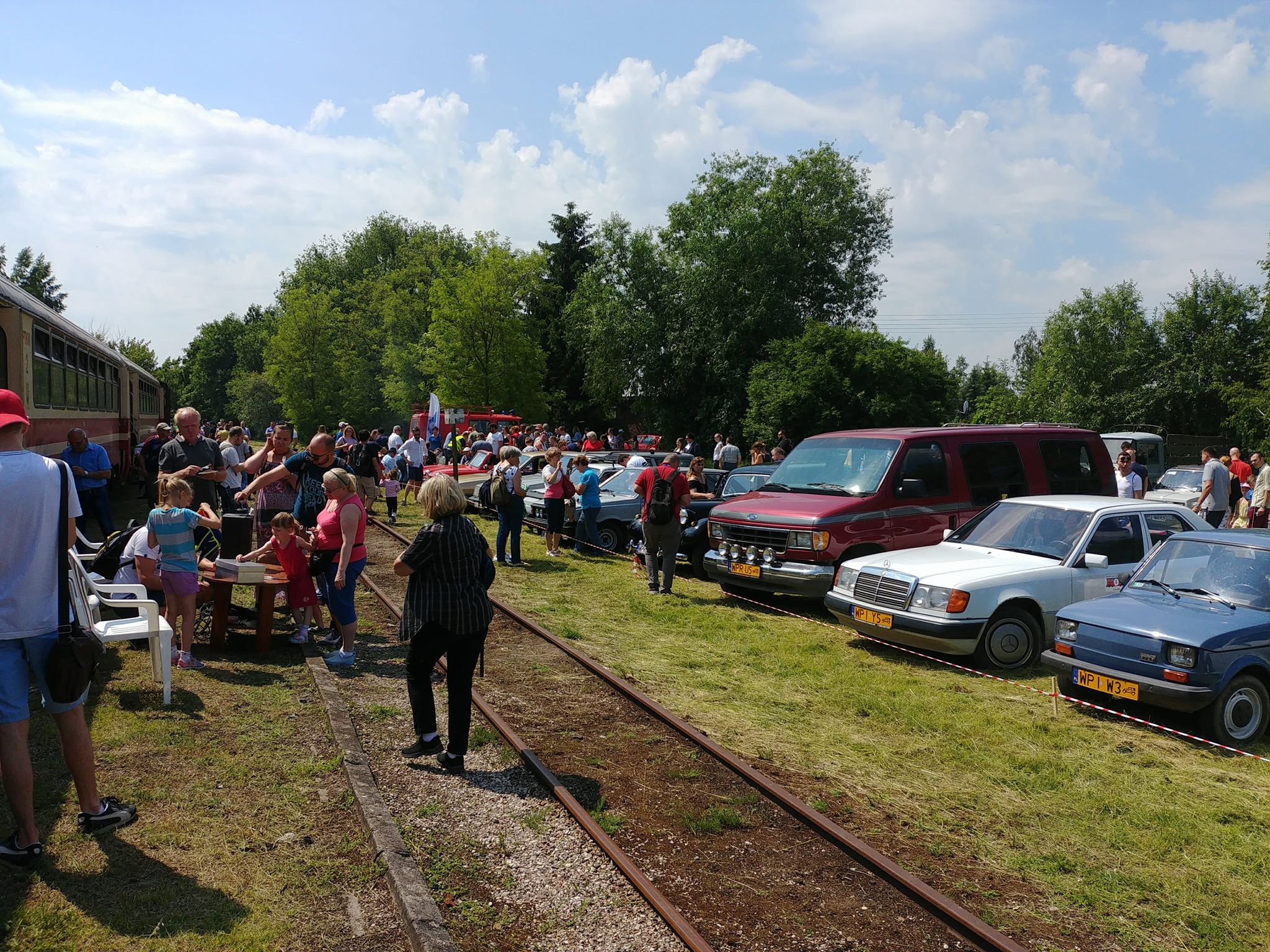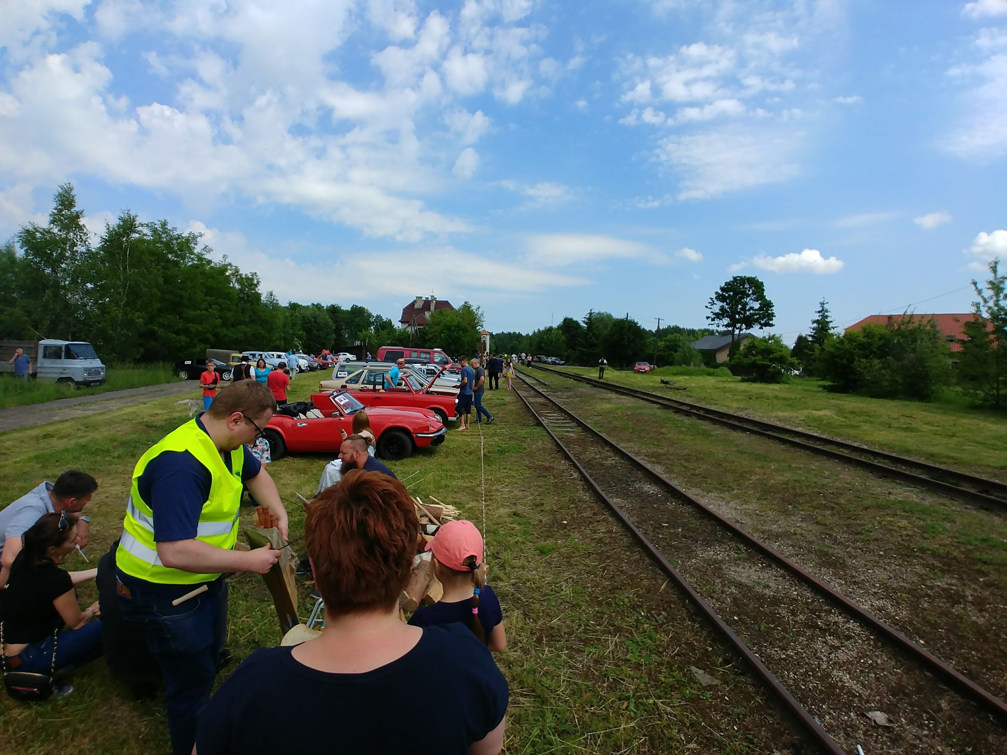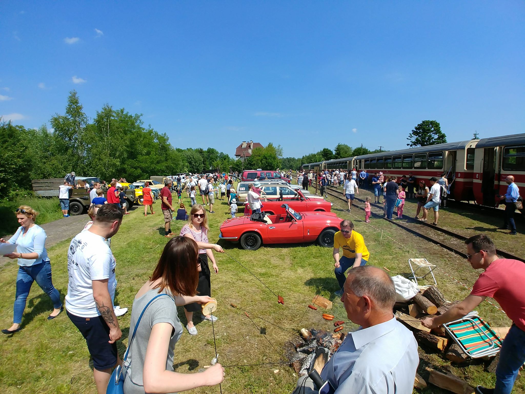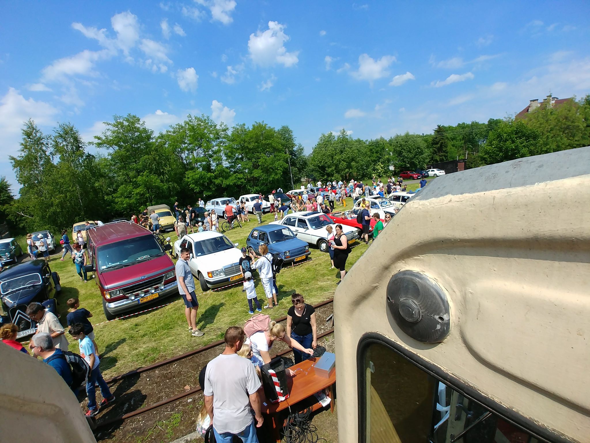 Tutaj uczestnicy rozwiązywali zagadkę pt. “jasny gwint” gdzie musieli dopasować różne gwinty lewe i prawe. Po czym piekli kiełbaski przy ognisku ( które wzorowo zabezpieczył Kornel wraz sąsiadem i zjawiskowym szarym żukiem) gdy nagle… nadjechała oczekiwana przez dużych i małych lokomotywa Lxd2 (produkcja  fabryki Augusta FAUR w Bukareszcie) Tutaj podziękowania dla pana Janusza, Henryka i Adriana za pokazanie uczestnikom jak działa lokomotywa. Zajechał pociąg  wraz z piknikowym składem i pasażerami, którzy pośród naszych rajdowiczów wybrali najpiękniejsze auto (Citroen BL 11 ) którego załoga ubrała się stosownie do epoki swojego wehikułu i zdobyła Puchar Pasażera. Myślę, że niejednemu kolejarzowi łezka się w oku zakręciła, gdy zobaczył tętniąca życiem i turystami stację Tarczyn. Stację, która takich tłumów nie wdziała pewno ze 30 lat.