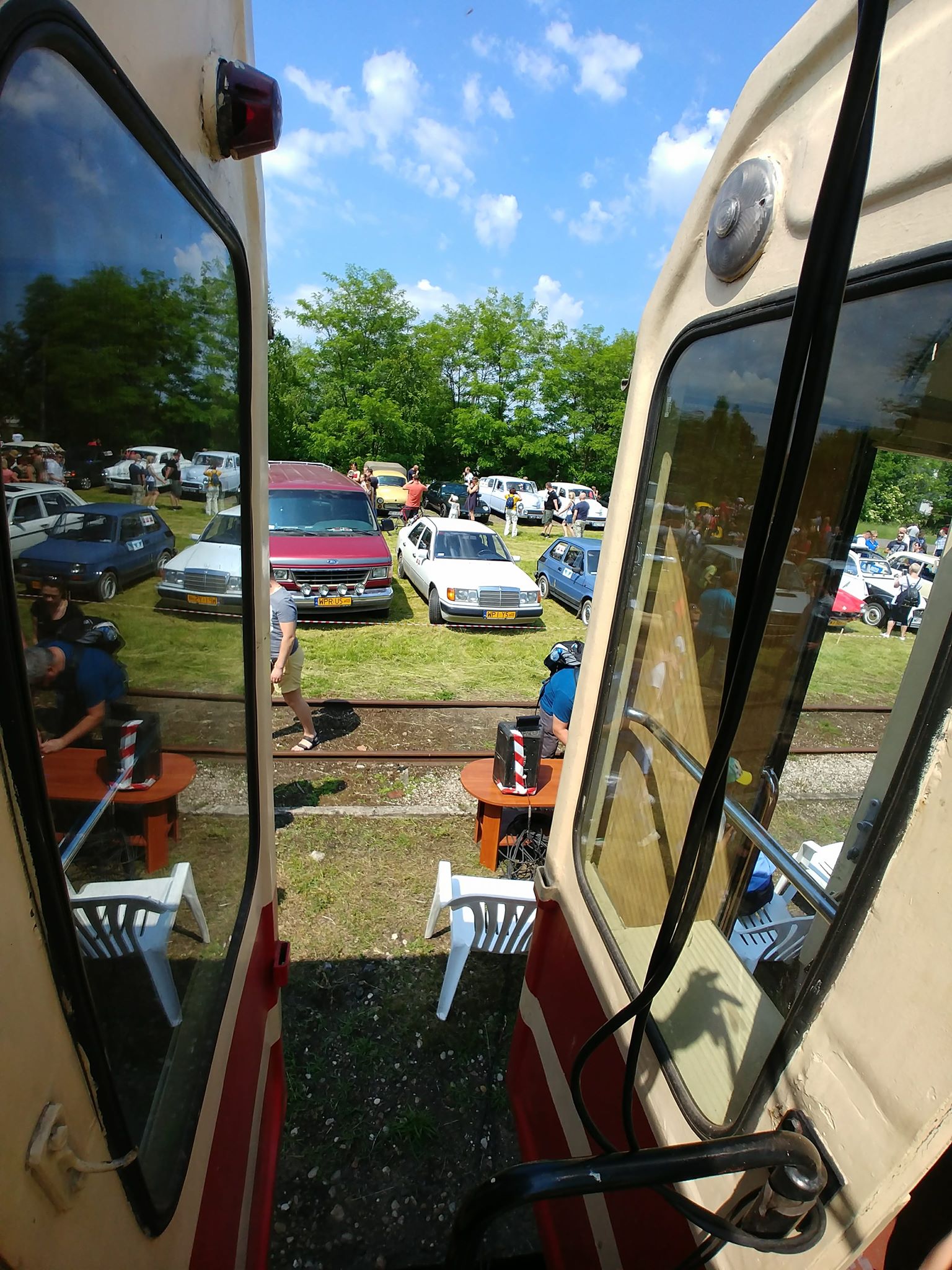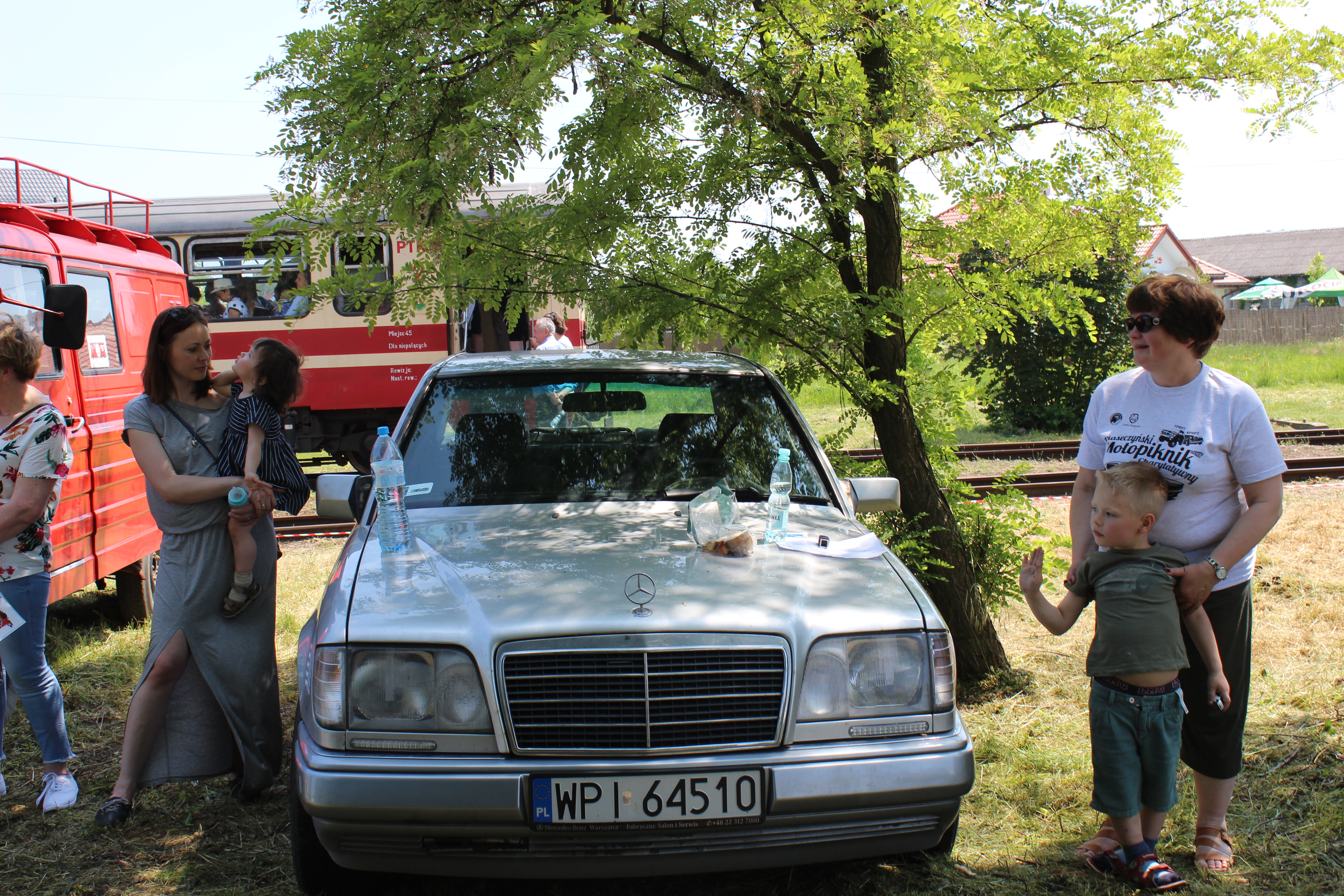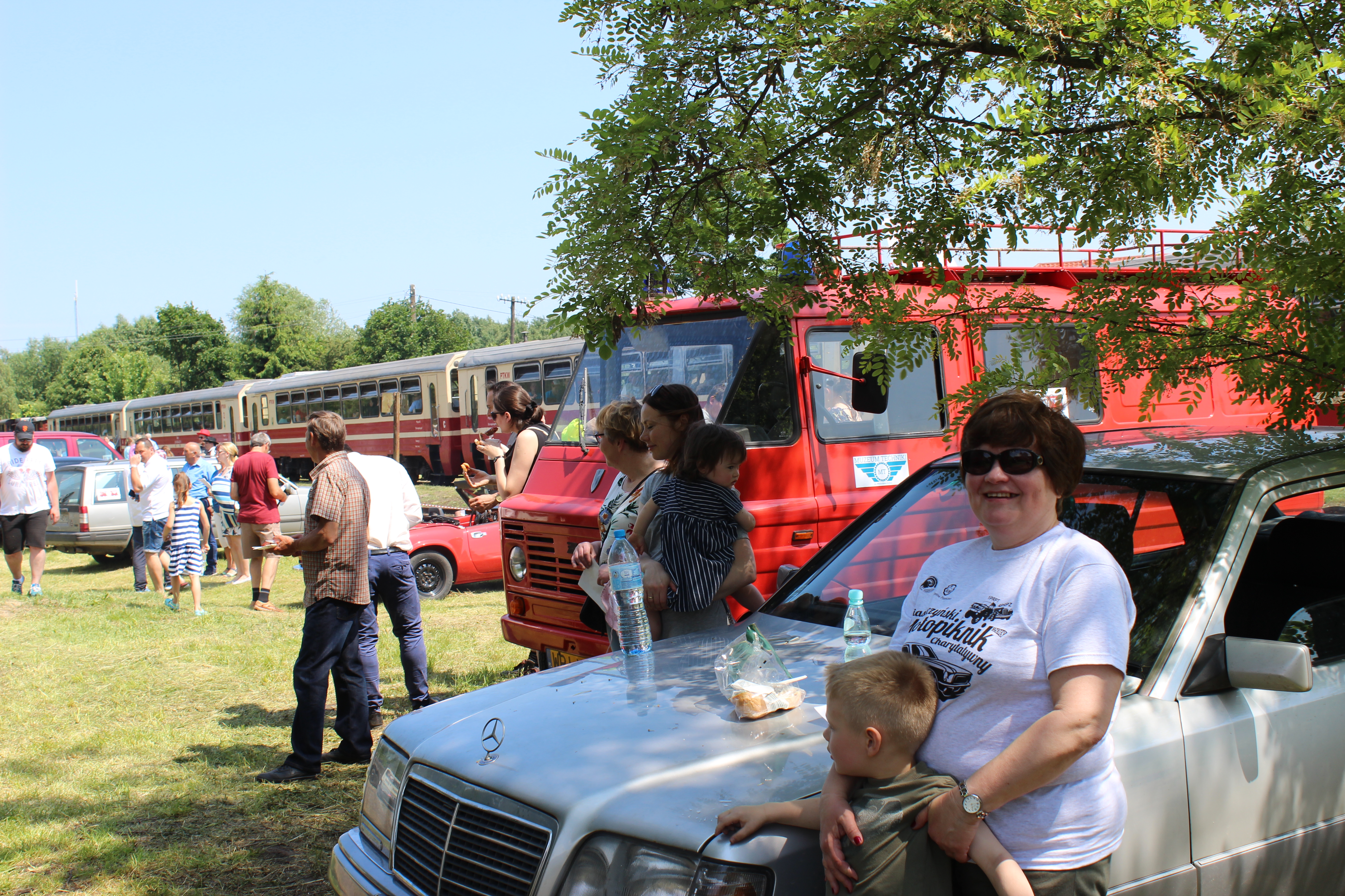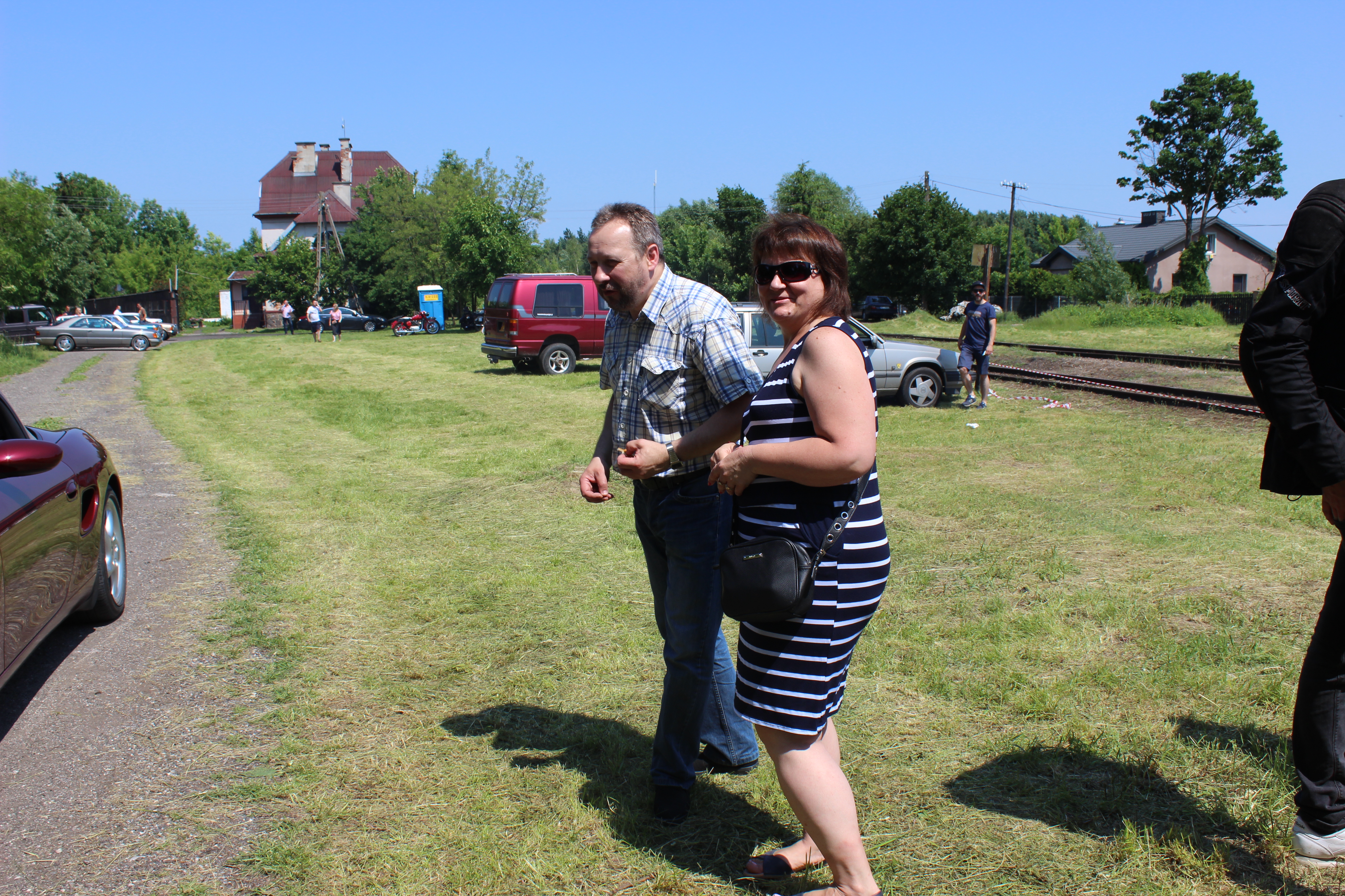Tutaj uczestnicy rozwiązywali zagadkę pt. “jasny gwint” gdzie musieli dopasować różne gwinty lewe i prawe. Po czym piekli kiełbaski przy ognisku ( które wzorowo zabezpieczył Kornel wraz sąsiadem i zjawiskowym szarym żukiem) gdy nagle… nadjechała oczekiwana przez dużych i małych lokomotywa Lxd2 (produkcja  fabryki Augusta FAUR w Bukareszcie) Tutaj podziękowania dla pana Janusza, Henryka i Adriana za pokazanie uczestnikom jak działa lokomotywa. Zajechał pociąg  wraz z piknikowym składem i pasażerami, którzy pośród naszych rajdowiczów wybrali najpiękniejsze auto (Citroen BL 11 ) którego załoga ubrała się stosownie do epoki swojego wehikułu i zdobyła Puchar Pasażera. Myślę, że niejednemu kolejarzowi łezka się w oku zakręciła, gdy zobaczył tętniąca życiem i turystami stację Tarczyn. Stację, która takich tłumów nie wdziała pewno ze 30 lat.