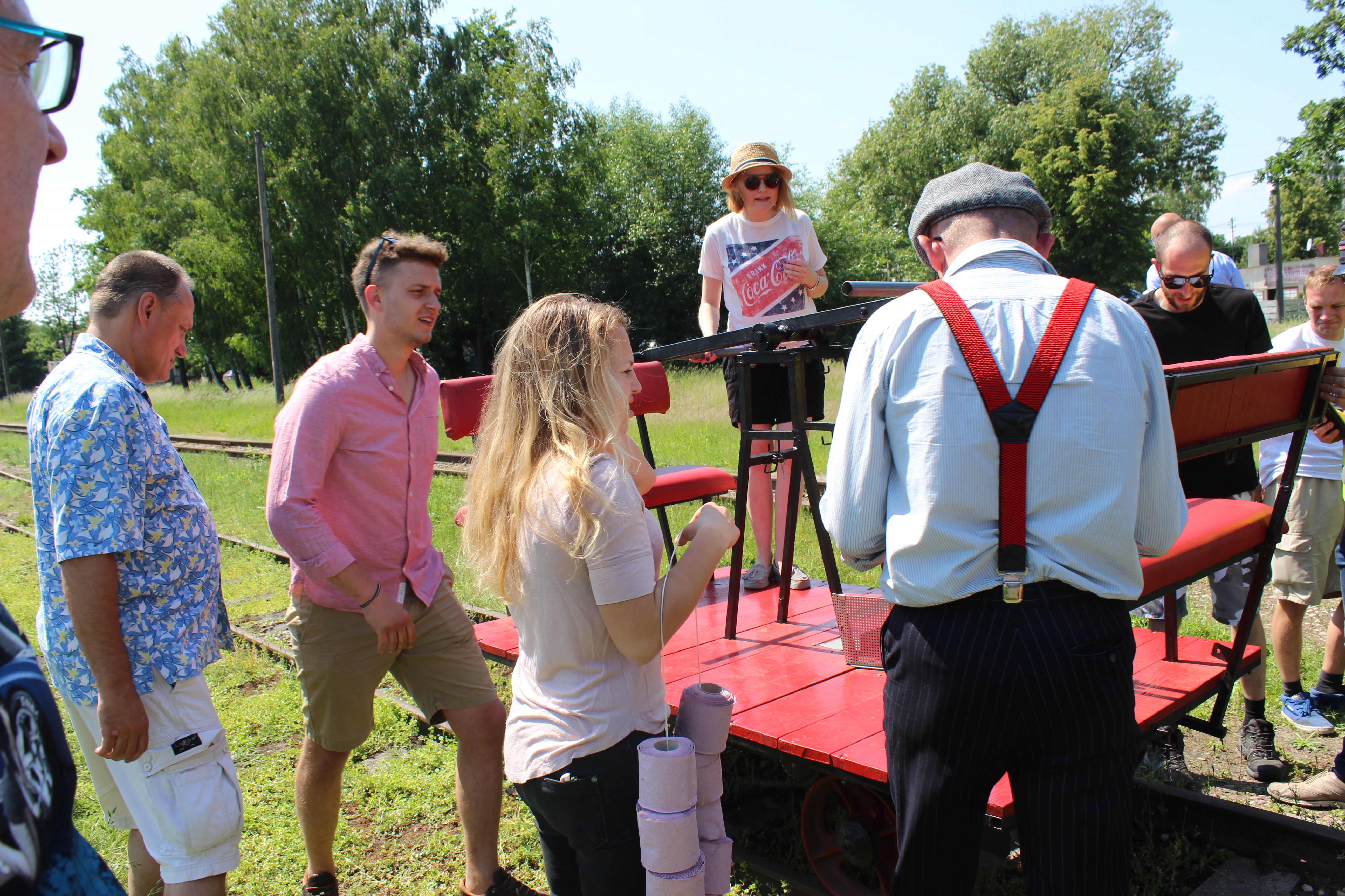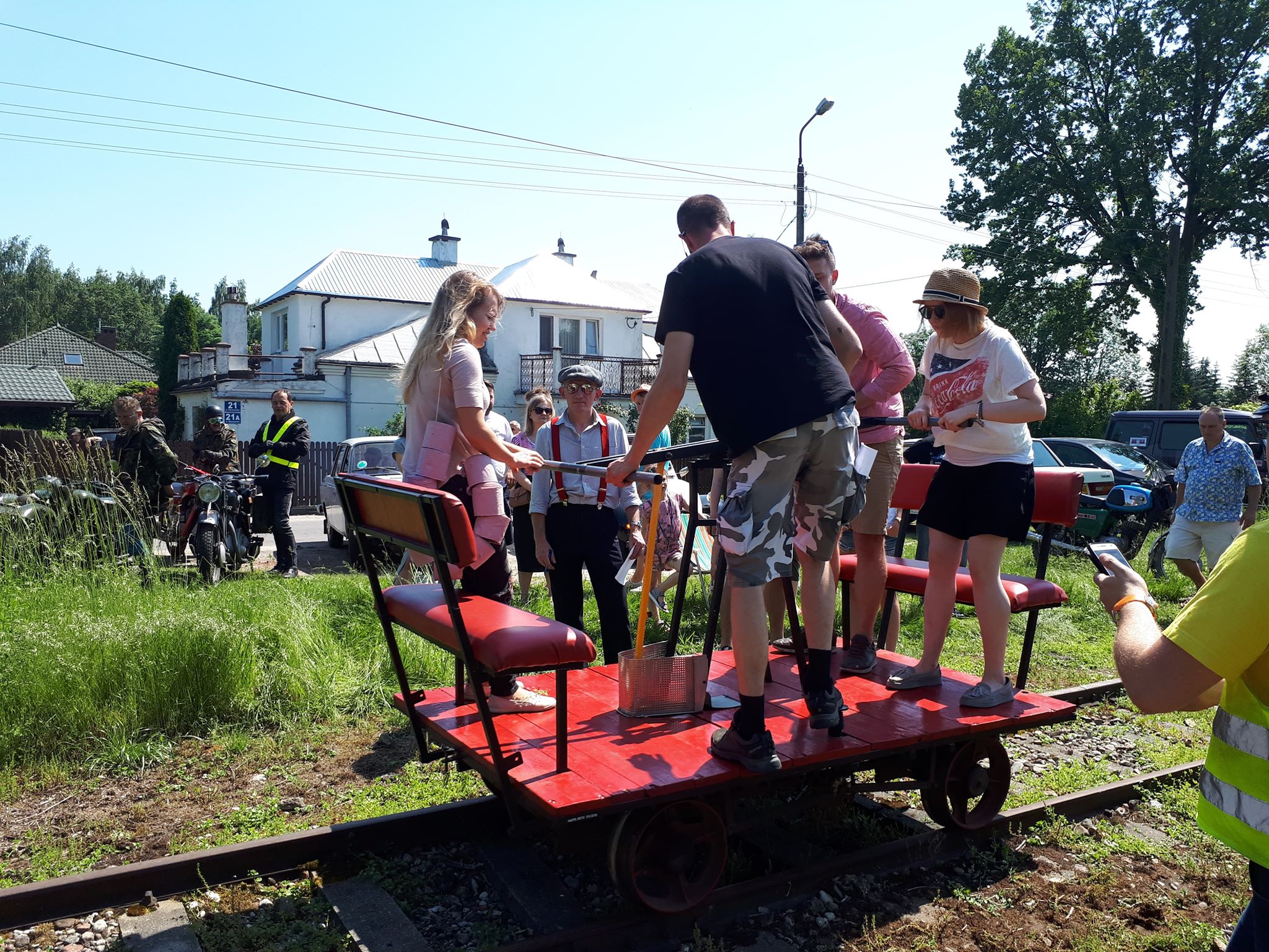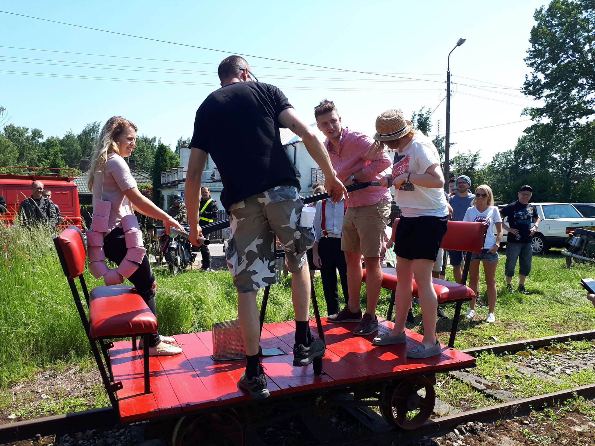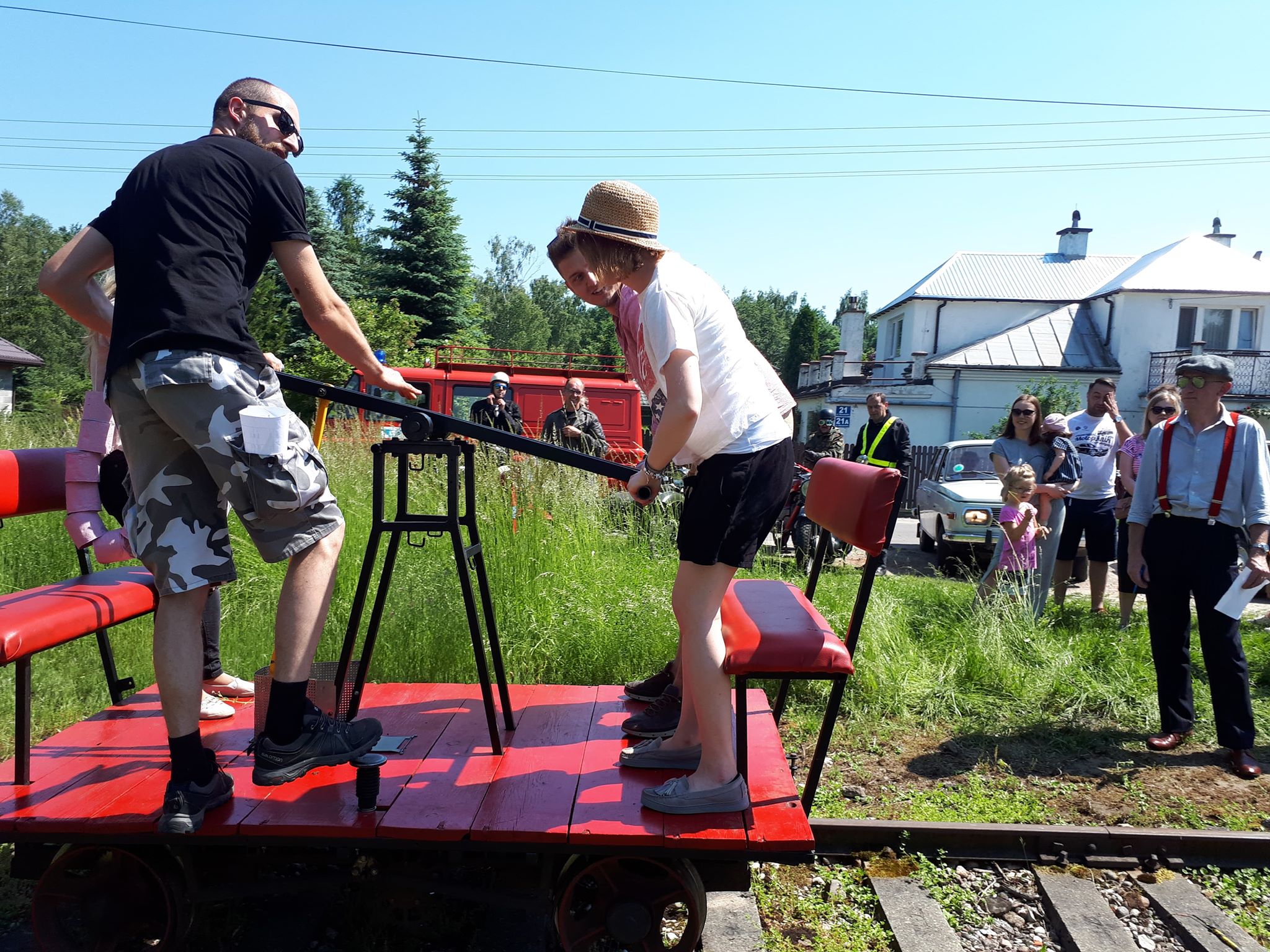 Tutaj uczestnicy rozwiązywali zagadkę pt. “jasny gwint” gdzie musieli dopasować różne gwinty lewe i prawe. Po czym piekli kiełbaski przy ognisku ( które wzorowo zabezpieczył Kornel wraz sąsiadem i zjawiskowym szarym żukiem) gdy nagle… nadjechała oczekiwana przez dużych i małych lokomotywa Lxd2 (produkcja  fabryki Augusta FAUR w Bukareszcie) Tutaj podziękowania dla pana Janusza, Henryka i Adriana za pokazanie uczestnikom jak działa lokomotywa. Zajechał pociąg  wraz z piknikowym składem i pasażerami, którzy pośród naszych rajdowiczów wybrali najpiękniejsze auto (Citroen BL 11 ) którego załoga ubrała się stosownie do epoki swojego wehikułu i zdobyła Puchar Pasażera. Myślę, że niejednemu kolejarzowi łezka się w oku zakręciła, gdy zobaczył tętniąca życiem i turystami stację Tarczyn. Stację, która takich tłumów nie wdziała pewno ze 30 lat.