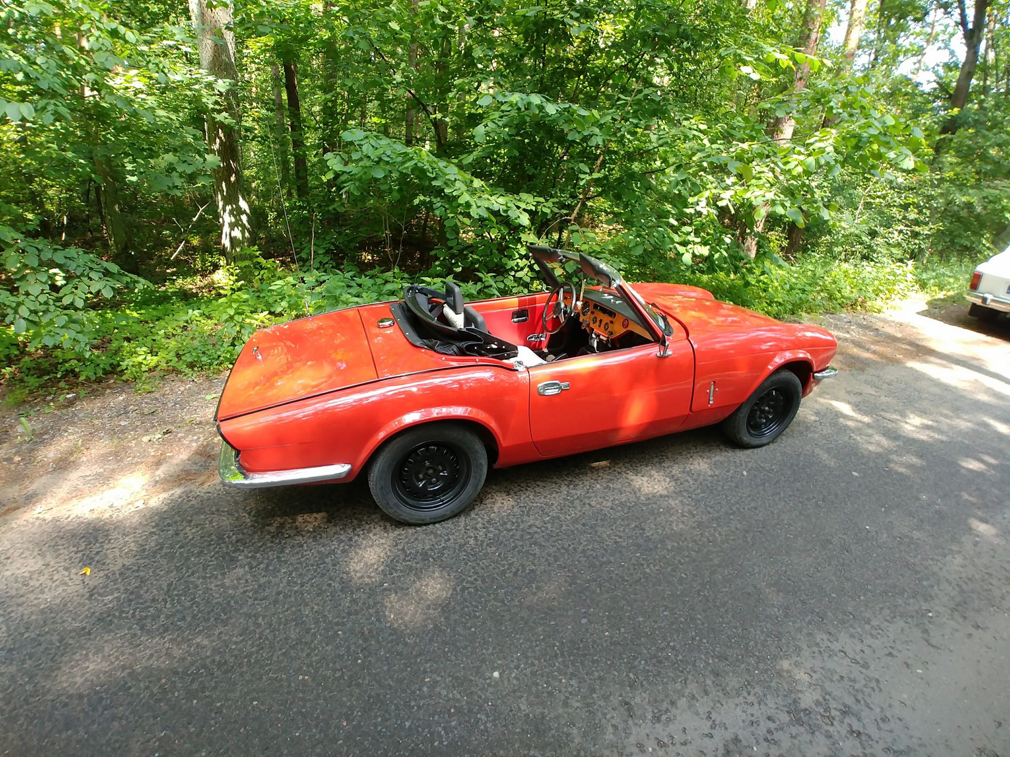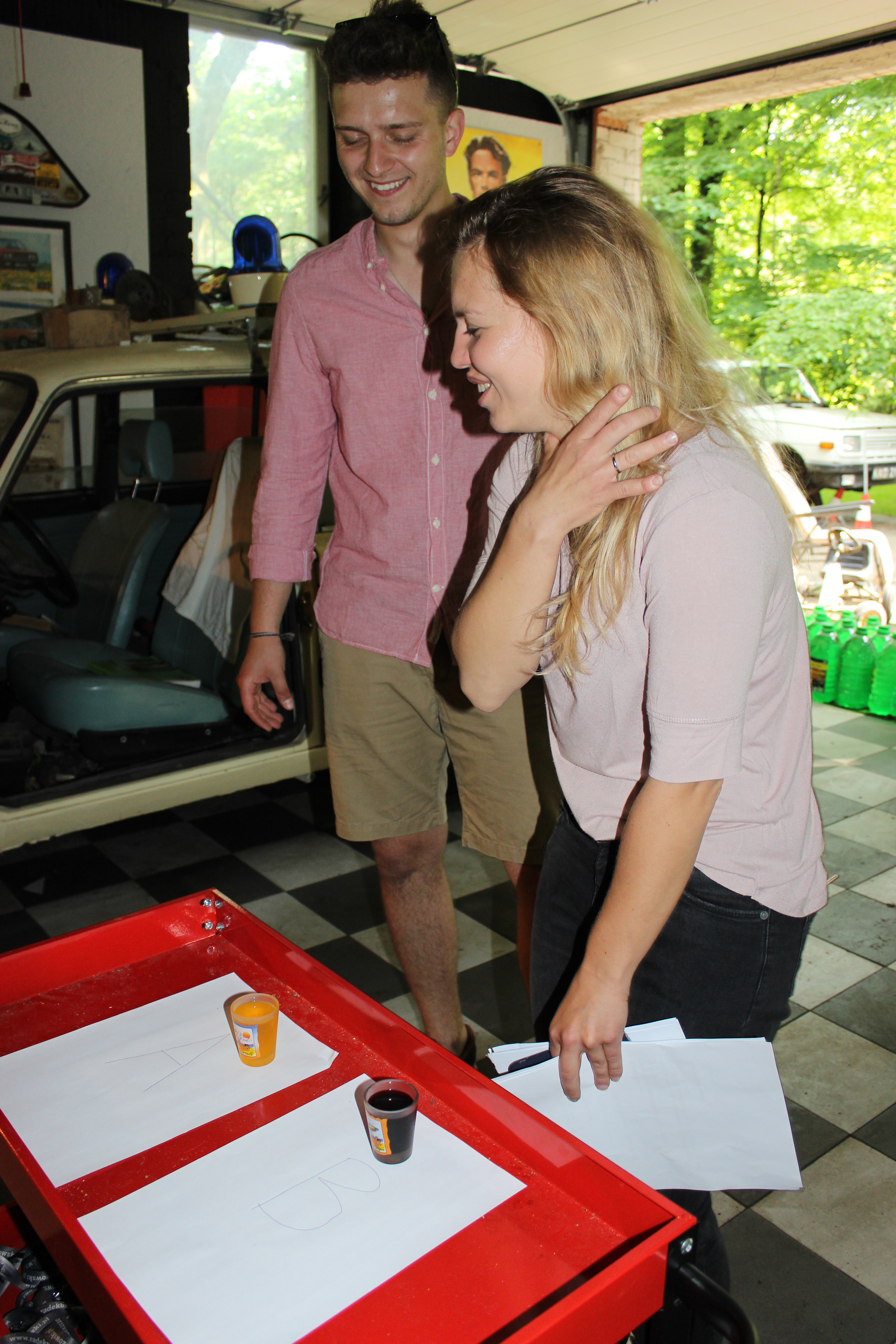 Pierwszą próbą była konkurencja strzału w poprzeczkę ( dziękujemy klubowi Jedność Żabieniec za spektakularna próbę, która okazała się kluczowa w klasyfikacji rajdu).  Następnie poprzez piękne tereny, nasze załogi odwiedziły skromny muzealny garaż w krainie leśnych boginków. Tu z kolei musieli rozpoznać płyny, czy to wino czy też płyn hamulcowy DA-1. Załoga nr 2 nawet odważyła się próbować 😉 i otrzymali upominki dla swoich aut.  Wyjeżdżając z jakże malowniczego Zalesia Górnego odwiedziliśmy teren dzielnicy filmowej(tutaj Sebo, nasz klubowy kolega ds. motocykli dzielnie regulował ruchem) szukając samochodu ford anglia oraz przedszkola Stefana.