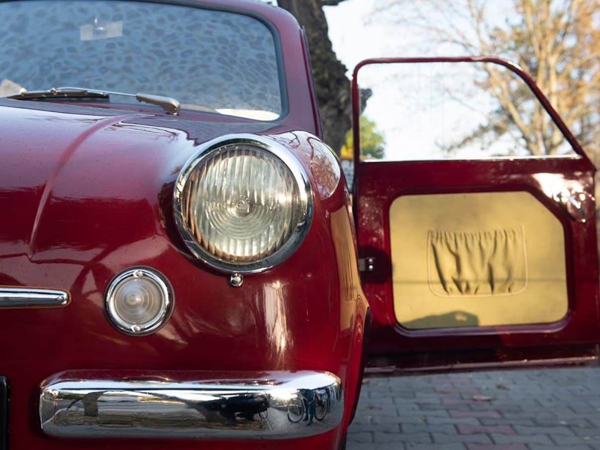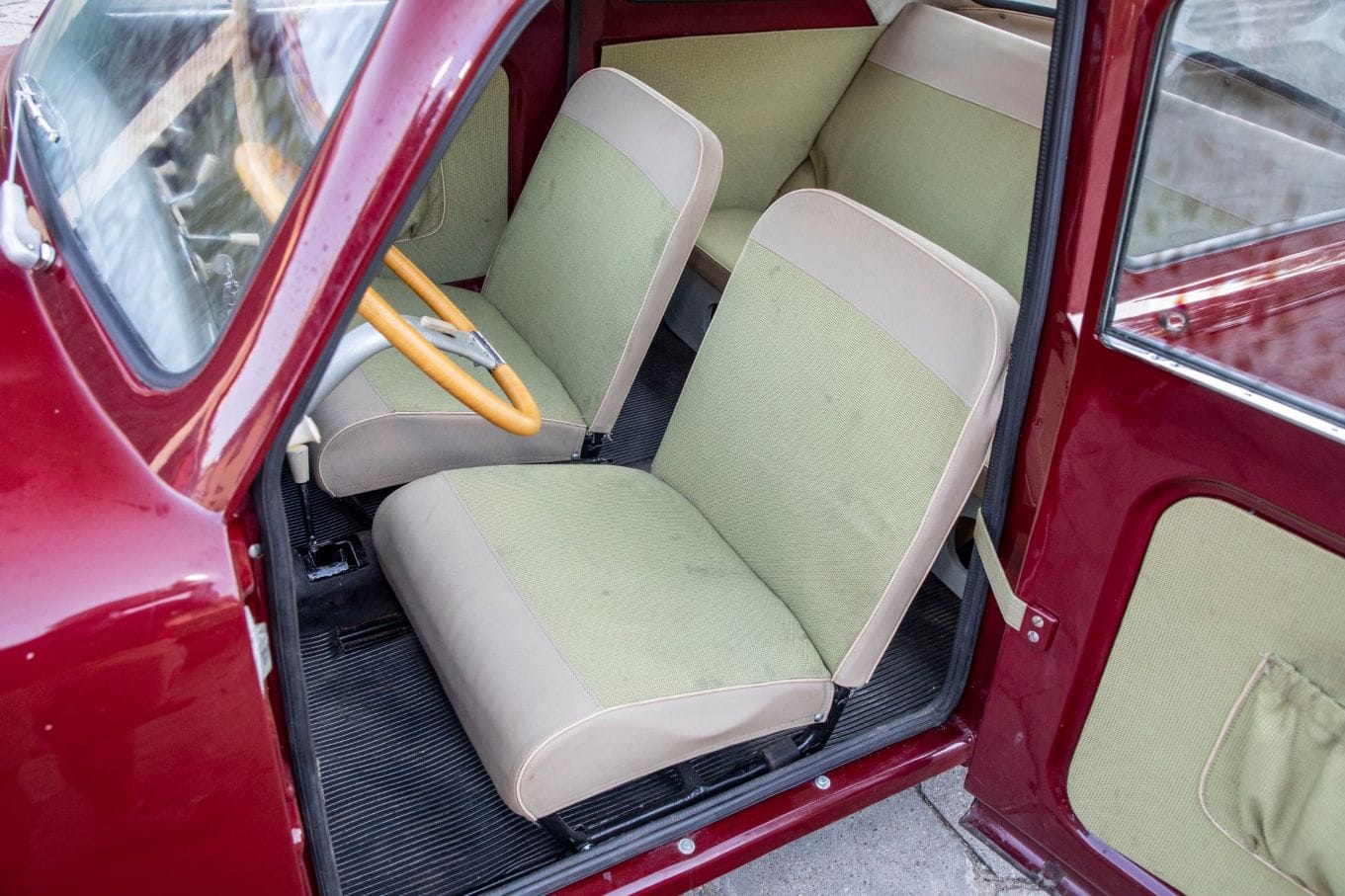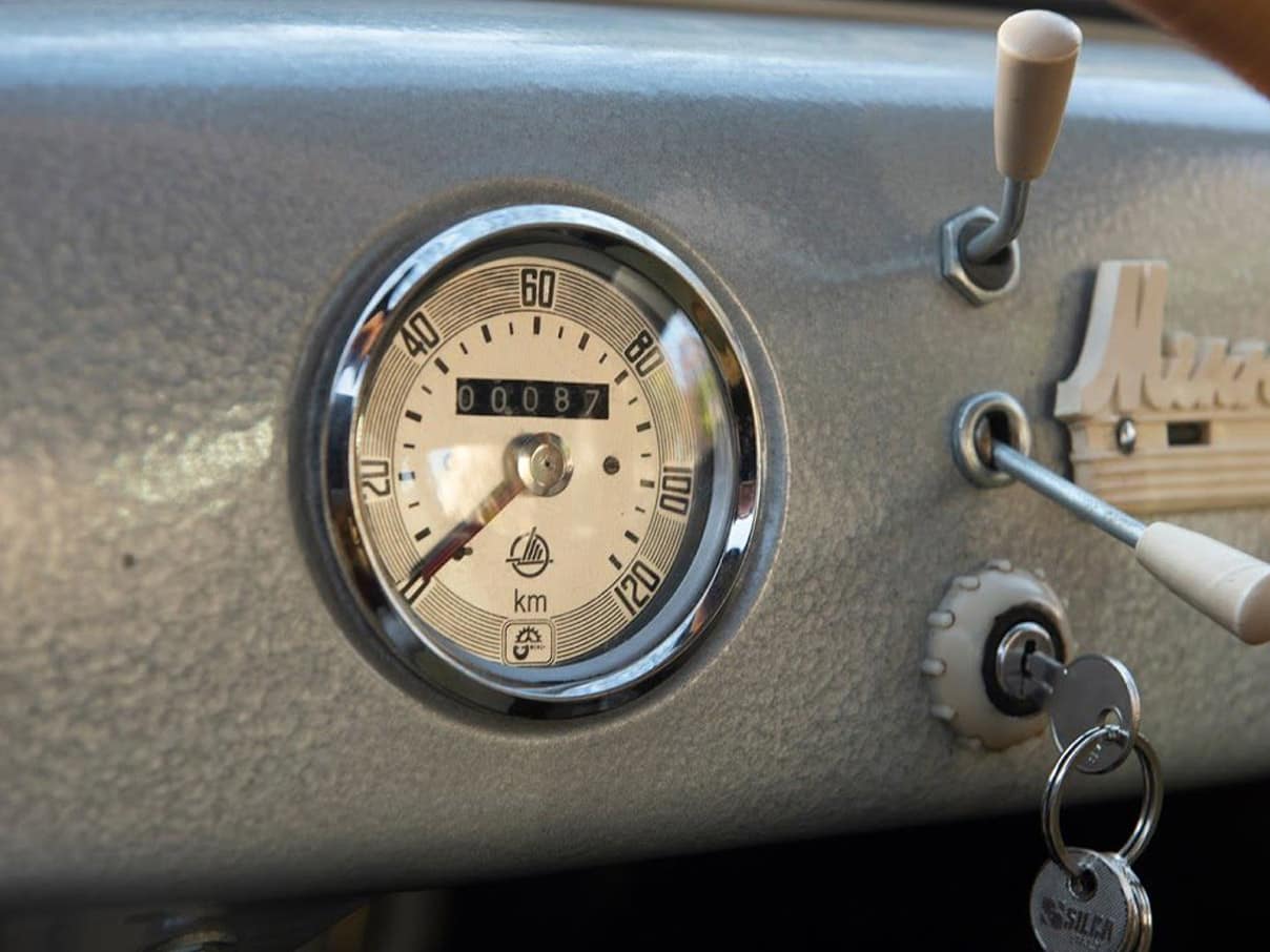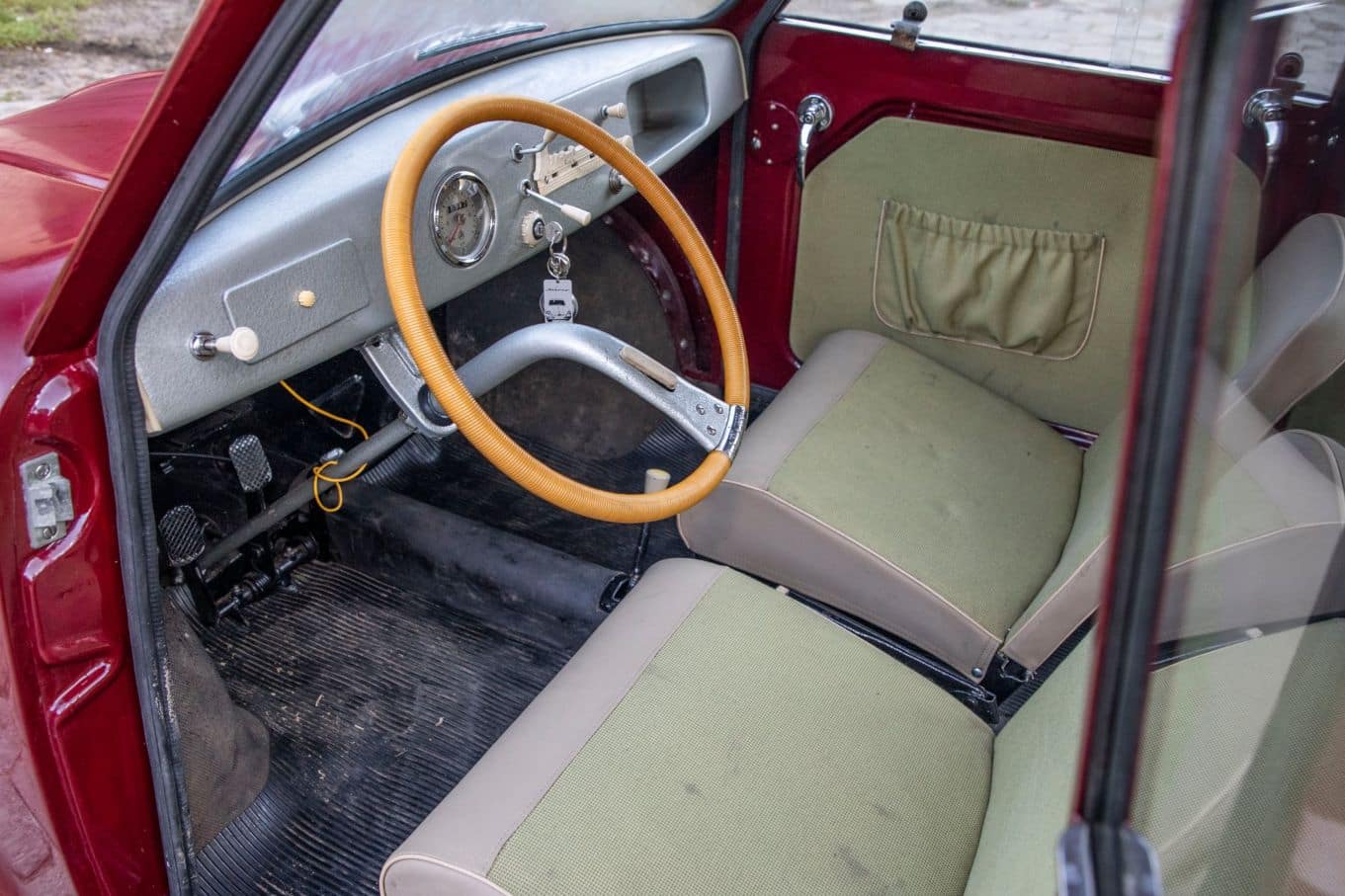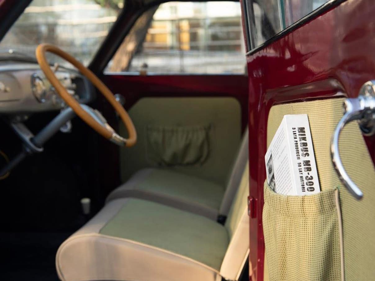 Tapicerka wykonana zgodnie z duchem epoki, choć grubej tłoczonej w skaju kraty nie ma już w ofercie żadna hurtownia. Pojazd w bardzo dobrej kondycji. Sprawny gotowy do drogi.